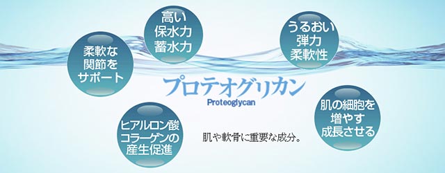 ヒアルロン酸の1.3倍という保水力と、EGF様作用を持ち、肌内部のコラーゲン、ヒアルロン酸の産生をサポートしてくれる働きのあるプロテオグリカン。