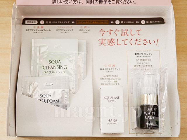 同梱の冊子類です。HABAの商品カタログや、使用方法、スクワランの効果についてなどが詳しく記載されていました。