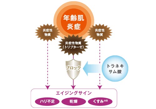 薬用成分のトラネキサム酸が、年齢肌炎症をケアすることで、ハリ不足・乾燥・くすみなど、エイジングサインを引き起こすトリプターゼをブロック。