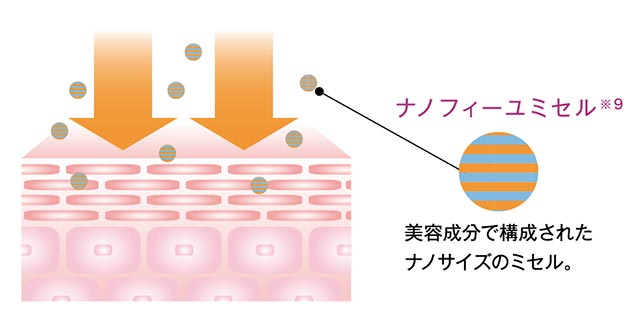 美容成分で構成されたナノサイズのミセルが、スムーズに浸透。角質層までしっかり美容成分をと溶けて保湿をしてくれます。
