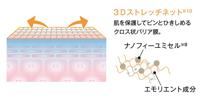 肌の表面で、クロス状のバリア膜を形成。肌を保護しながら、ピンと引き締め、潤いを閉じ込めます。